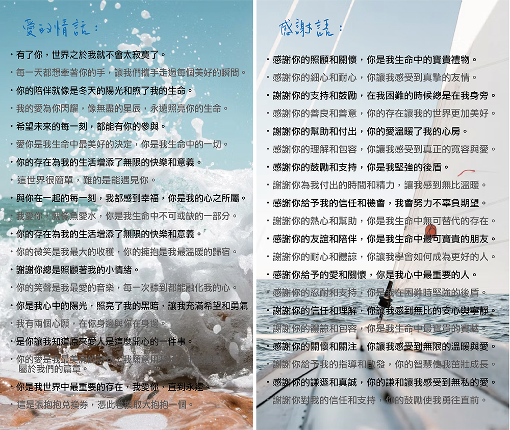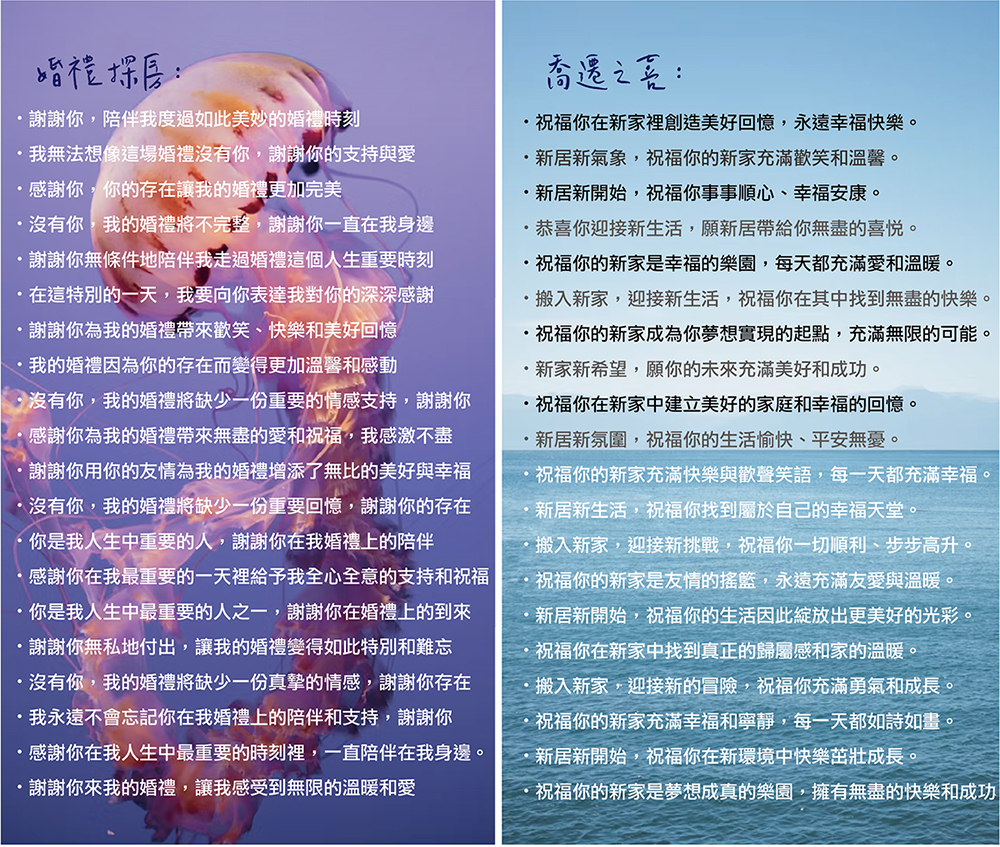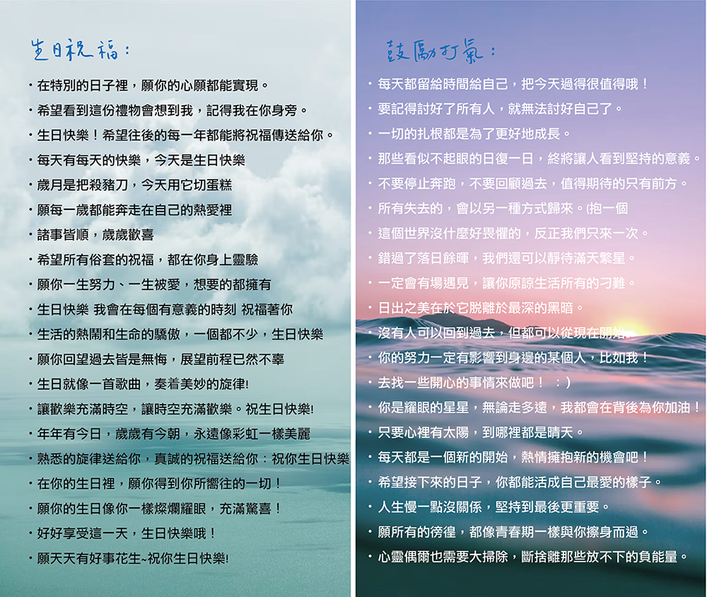 (此服務下訂時請選第三個選項,並於訂單內告知想要以下哪款內容!若需要客製化印刷自己寫的句子也可以,請私訊。此服務約需要三個工作天)